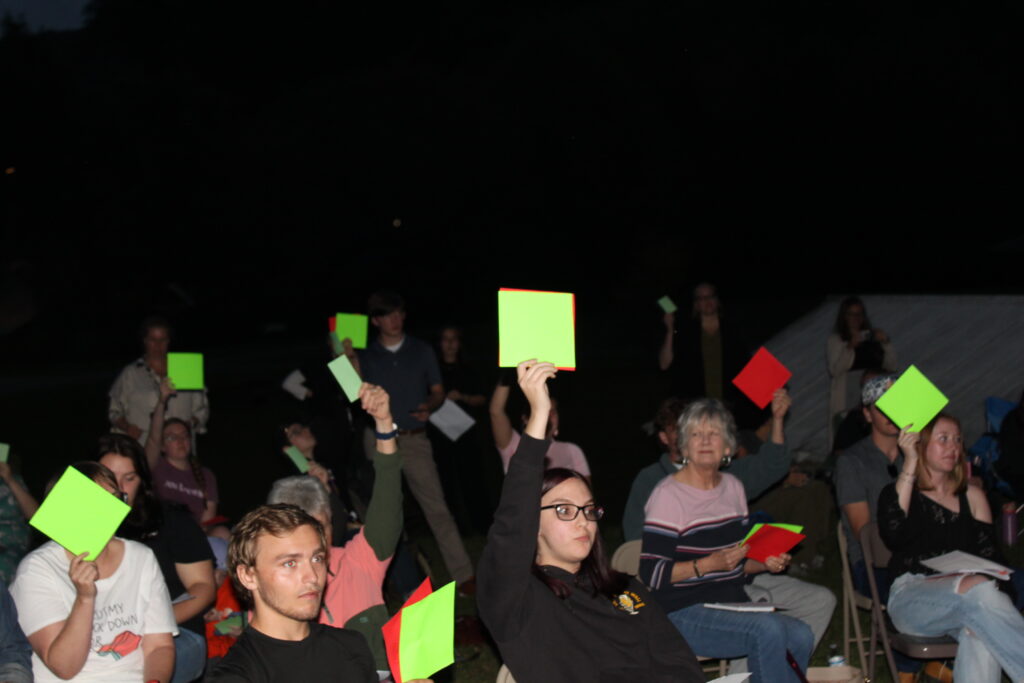 Once both arguments regarding the guilt of war were heard, attendees served as jurors, voting charge by charge with red and green cards to determine war’s guilt, ultimately finding war guilty of mass destruction, theft, disturbing the peace, manipulation of youth, fraud, possession of weapons of mass destruction, emotional abuse of veterans and being a repeat offender.